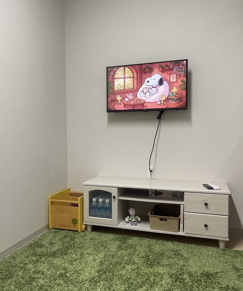 キッズスペースをご用意しています。ラグマットを敷きお子様はゴロゴロすごせます。絵本やおもちゃ、チューナーレステレビをご用意してありますので安心してご来院下さい。