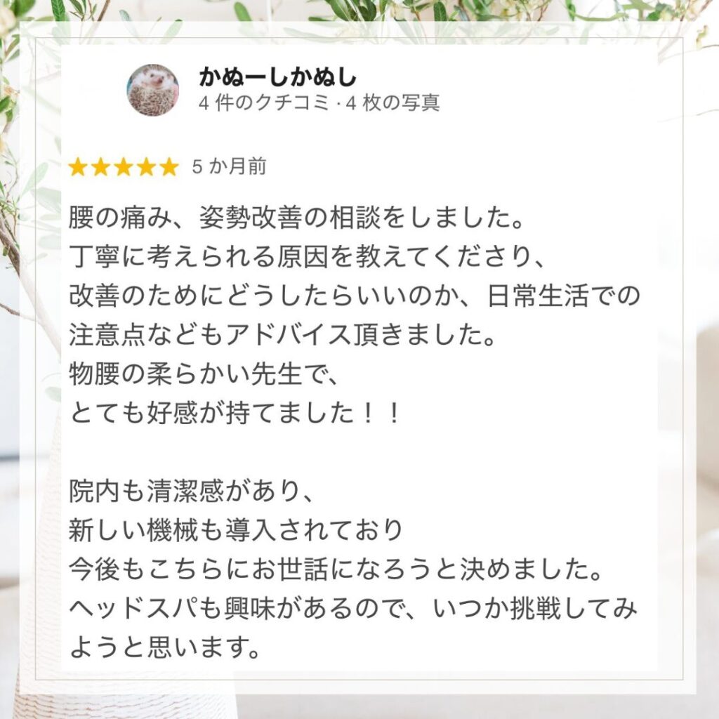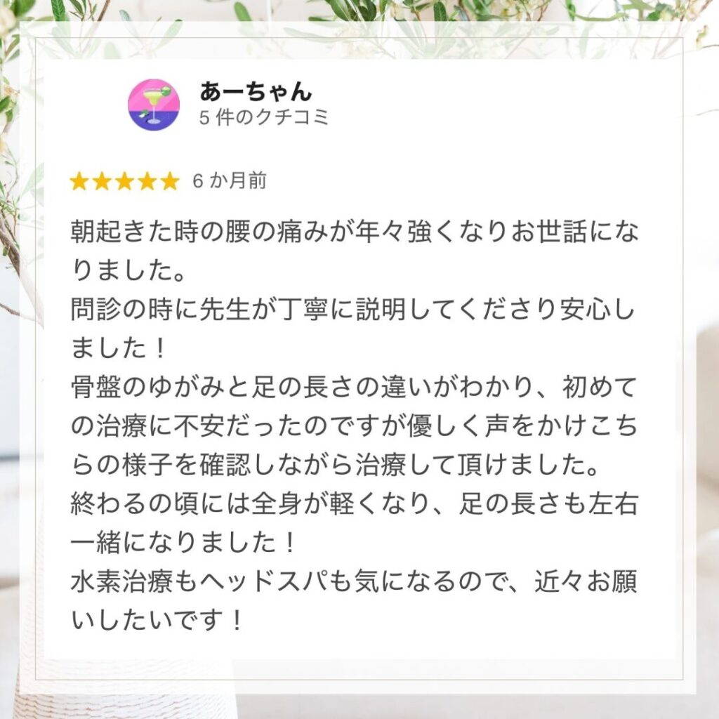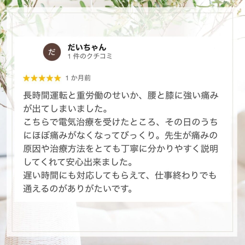 当院では施術前にしっかりと問診を行っております。痛みの症状をしっかりと把握しこれからどう施術していくのか分かり易くご説明いたします。ご不明な点がございましたら、遠慮なくお申し付けください。